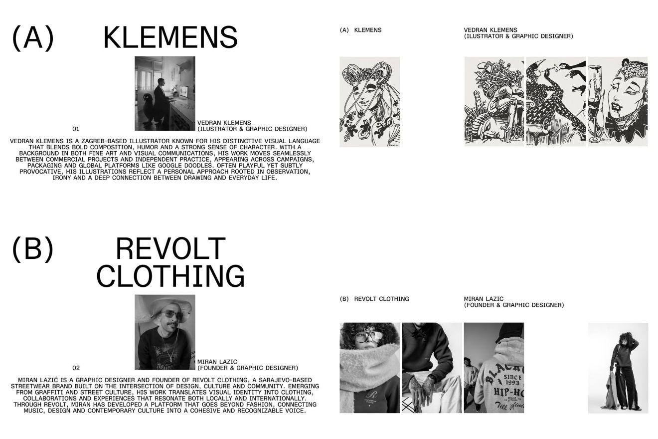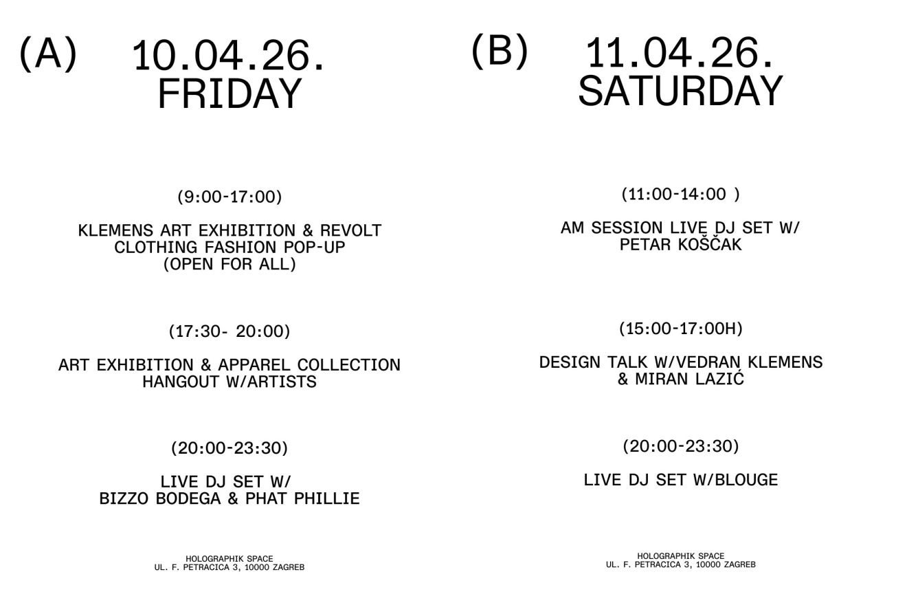 10. i 11.04.2026., Zagreb očekuje dvodnevni pop-up projekt, temeljen na suradnji sarajevskog streetwear brenda REVOLT Clothing i zagrebačkog ilustratora Vedrana Klemensa - autora čije ilustracije nisu samo “lijepa slika”, već uvijek karakteri s pričom i vlastitim identitetom.