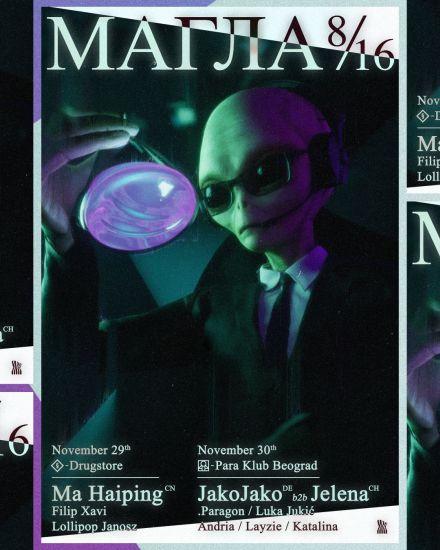 МАГЛА 8/16 je događaj koji će se odvijati 29. i 30.11., puna 24 sata, u dva beogradska kluba: Drugstore i Para. U Drugstoreu nastupa Ma Haiping, gost iz Kine, Filip Xavi i Lollipop Janosz, a u Para klubu rezidenti .ParagonParagon, Luka Jukić, Andria, Layzie i Katalina, pored dve dame koje će nastupiti u b2b varijanti: Berghain rezidentkinja DJ JakoJako i devojka iz Švajcarske s balkanskim korijenima, Jelena koja nam je odgovorila na nekoliko pitanja...