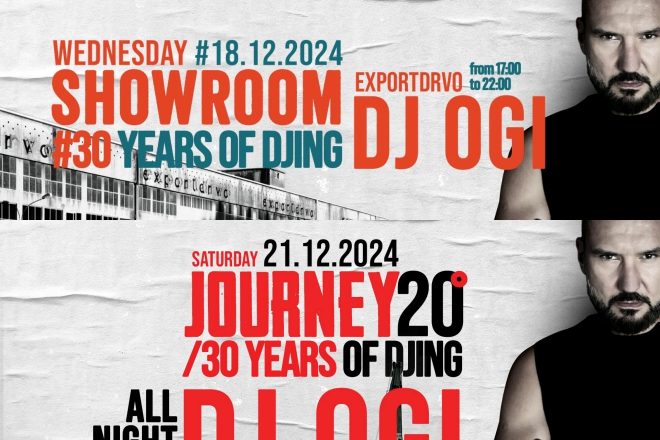 Novosti DJ Ogi obilježava 30 godina karijere Proslava počinje u srijedu, 18.12., izložbom u Exportdrvu, a nastavlja se u subotu, 21.12., u klubu Crkva